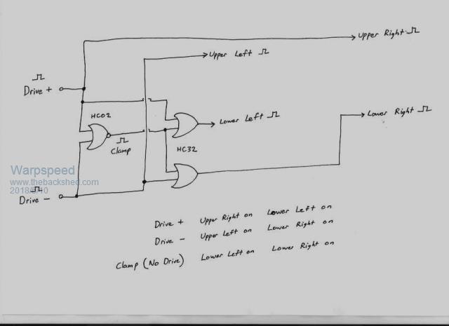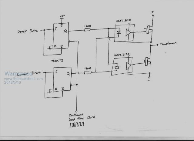 First I used some logic gates to develop the four individual bridge drive signals from the two eprom data bits. ![]() These four bridge drive signals then must have some suitable dead time added. I did that using JK flip flops. A logic low instantly resets the flip flop giving fast turn off. But a logic high on the J input does nothing until the next clock edge arrives. The frequency of the dead time clock can be changed to set the required dead time. The advantage of doing it that way is that with one movable link I can change the dead time on all sixteen JK flip flops together. And then there is the inverse opto coupler connection trick which makes simultaneous cross conduction of both upper and lower mosfets all but impossible. ![]() ![]() Cheers, Tony. |
