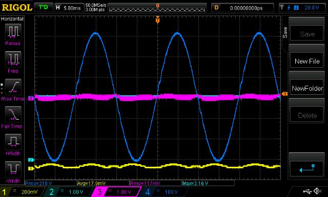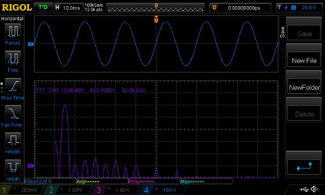 Time to look at waveform purity. I calculate the THD of this prototype inverter to be about 0.5% (50Hz 70db, 3rd 25db, 4th 25db, 5th 20db, 6th 20db) via the DSO's FFT.