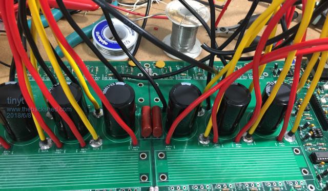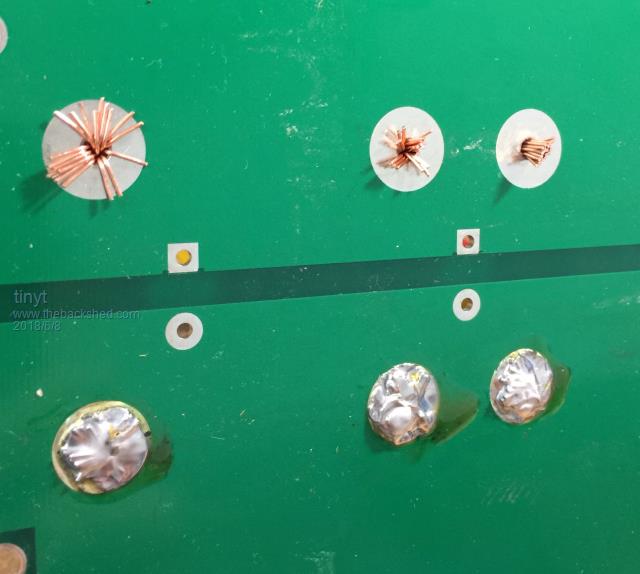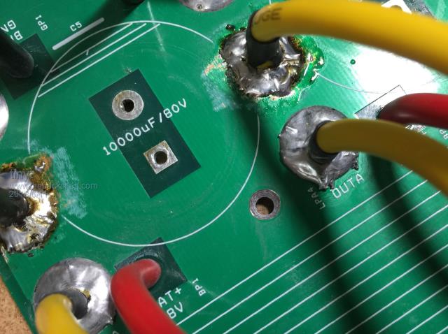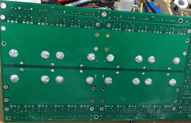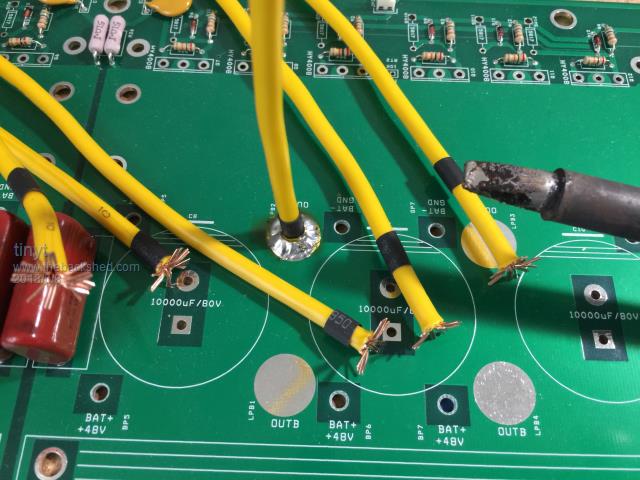 Started to solder awg #10 wires for the transformer connection. The black heatshrink is to prevent the strands from spreading out during soldering. ![]() Doing the bottom for the battery wires. Notice the creepy crawlies coming out of the holes. ![]() ![]() Top view shows the forest of wires, all of them are awg #10 (2.588mm, 5.26 sq.mm). ![]() So for the 6 group of the yellow wires for each of the transformer primary connections, the total cross section is 31.56 sq. mm, equivalent to 6.34 mm dia.(awg #2) The battery wires are 8 each ( 8 red for +, 8 black for -), the total for each polarity is 42.08 sq. mm, equivalent to 7.32 mm dia. (awg #1) |