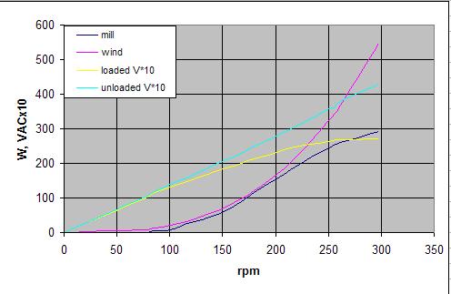 I have included on the graph, curves for cubic wind energy, calculated alternator output power, loaded AC voltage and unloaded AC voltage without doubler.