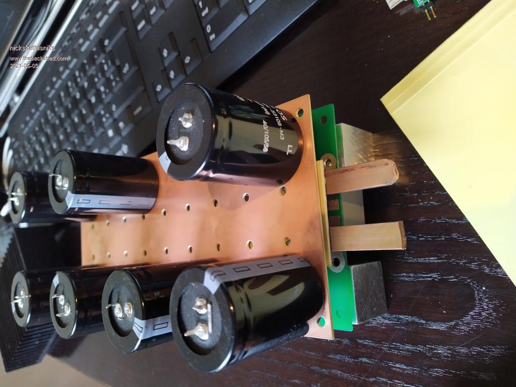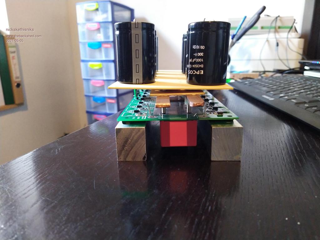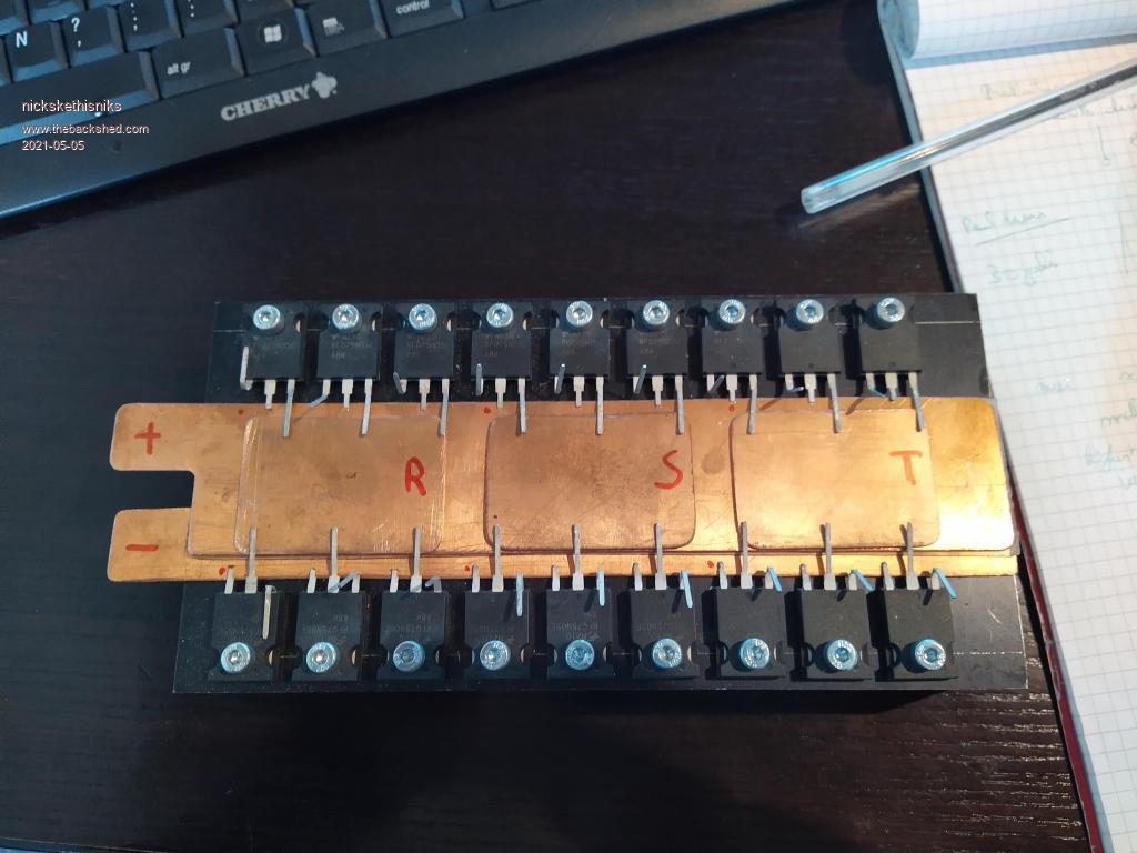It also bears a slight resemblance to Nicks laminated busbar idea. Not quite so neat, but it uses busbars bolted to the circuit board  to carry the heavy current.