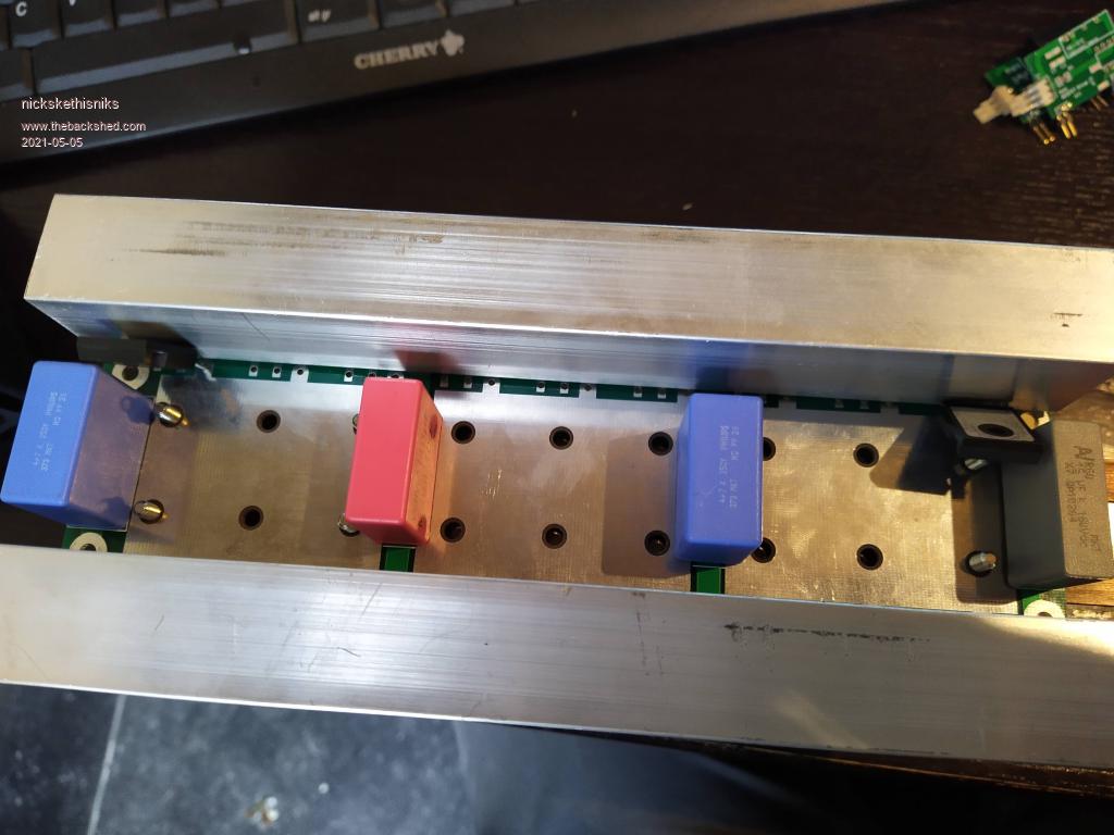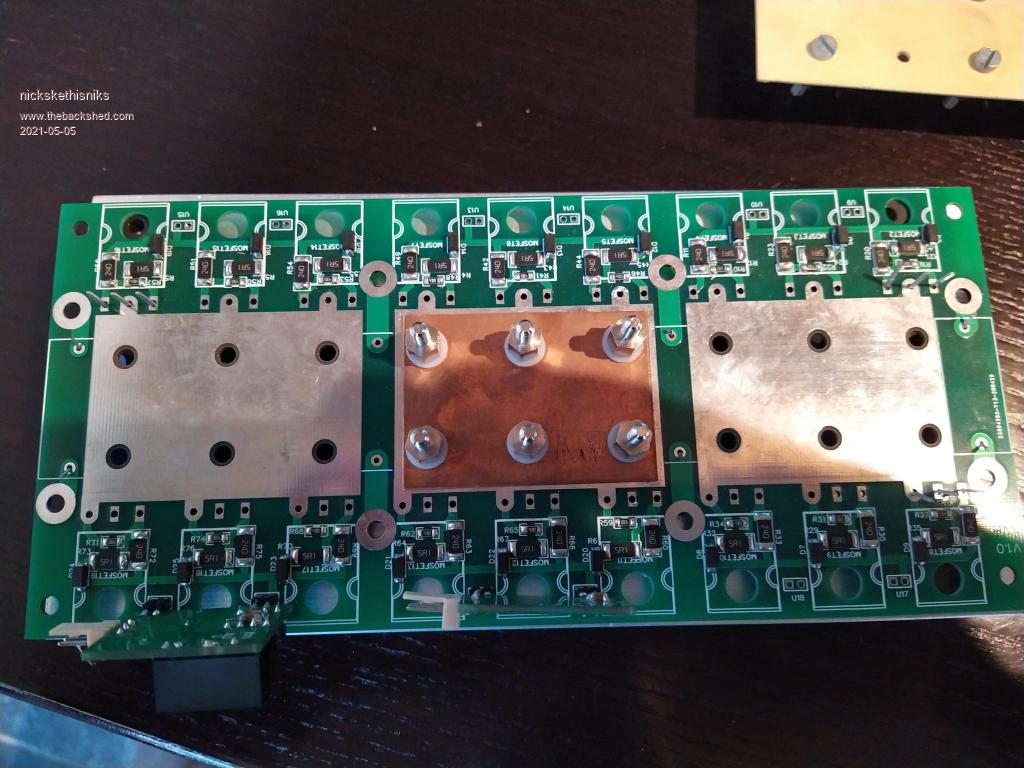 Installed in a metal enclosure with still only half the mosfets installed. The mosfets are inside, but the heatsink is outside the enclosure.