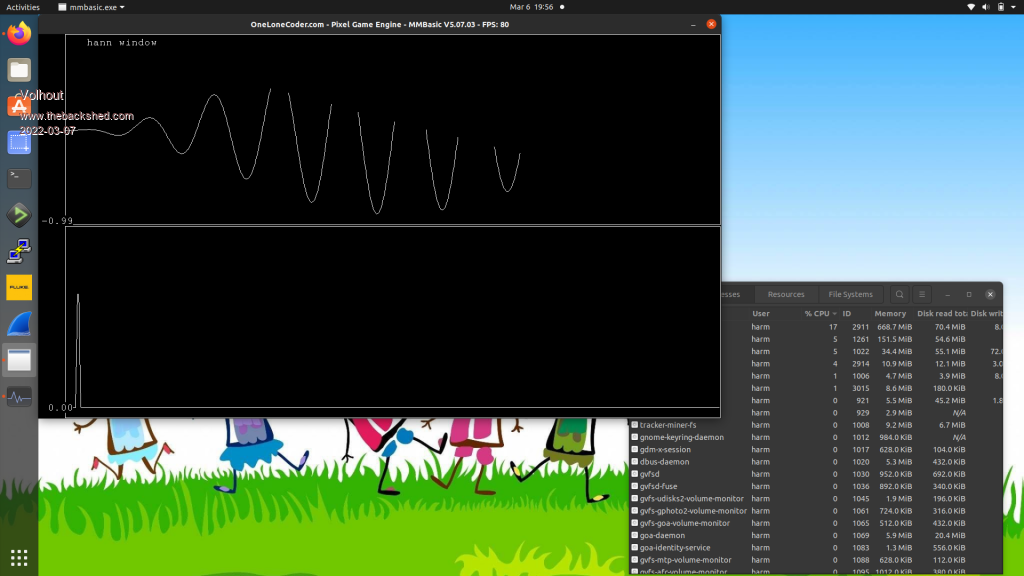 @Peter The efficiency increased significant. But you tuned it a bit to far, If you run the fft program and press "w" a few times slowly (do not repeat too fast) the graphics driver stops before it is finished drawing. ![]() The top graph is drawn partially.Also some text is not drawn. When you repeat the "w" fast and regular, the drawing completes. I guess you have an algorytm to sleep the drawing engine that could be tuned. Volhout P.S. this is MMBasic on Wine. Maybe this does not happen in W10/W11 Edited 2022-03-07 05:00 by Volhout PicomiteVGA PETSCII ROBOTS |
