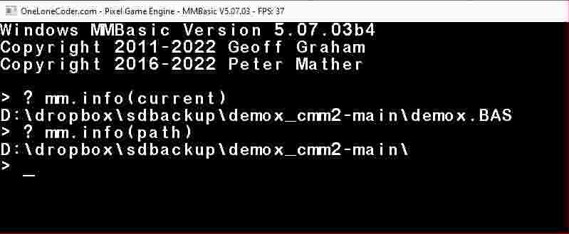 Back in the land of sanity (I hope), is MM.INFO$(PATH) not implemented ? Best wishes, Tom MMBasic for Linux, Game*Mite, CMM2 Welcome Tape, Creaky old text adventures |