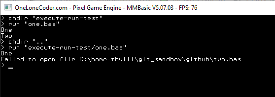 Good morning Peter, Thanks to your recent changes I've almost got my unit-test framework up and running and things are mostly green. However here's a blocker for running the entire suite in a single command. Setup: 1. MKDIR "execute-run-test" 2. CHDIR "execute-run-test" 3. Create a file "one.bas" in this directory: Print "One" Execute "RUN " + Chr$(34) + "two.bas" + Chr$(34) 4. Create a file "two.bas" in this directory: Print "Two" Now observe the following: ![]() On the CMM2 this would have worked and output: One Two This is because on the CMM2 when you run one program from another the relative path to the new program is "correctly" resolved from the directory containing the running program, whereas on MMB4W it looks like it is resolved from the current working directory. EDIT: Though for the life of me I can't make head or tail of the CMM2's file opening code, does your keyboard only have the letters i, p & q on it ![]() Best wishes, Tom Edited 2022-03-07 21:07 by thwill MMBasic for Linux, Game*Mite, CMM2 Welcome Tape, Creaky old text adventures |