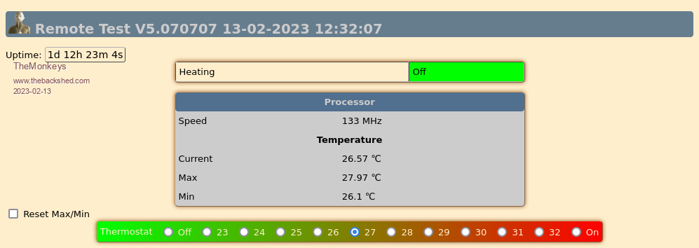With my router, the first attempt to reconnect results in a failed attempt and IP of 0.0.0.0 The next attempt connects OK. This means that an automatic reboot will not recover. I found out the hard way that an innocent { in your html will create a "Prefix" error. I know we were told to use two {{ Trying to load a page with too many images will cause grief. There are only 4 connections allowed and browsers tend to download in parallel. Just to test the system over a realistic link, I have opened up a port from the nasty old world. http://tassyjim.ddns.net:50080 It will probably fall over a lot... The link is not a permanent thing but should be OK few a few days. Jim Edited 2023-02-13 15:22 by TassyJim VK7JH MMedit |