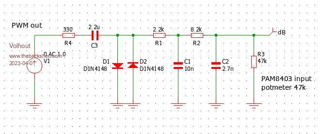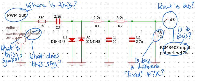 The heartbeat LED can be disabled but it is just highlighting the problem. As it switches on and off it is loading / unloading the regulator so its noise is changing. OPTION HEARTBEAT OFF will make it less obvious. In Toms annotated circuit:- Where is this? = PWM out = Pico audio out pin What does this say? = DAC01 = digital to analogue converter 1 What is this symbol? = signal source (above three are all the same thing) Is this a "different" 47k? = no it is the PAM8403 input potentiometer. What it this? = dB = measurement point (in decibells) for the circuit simulator - not part of the circuit Is it this? = no |
