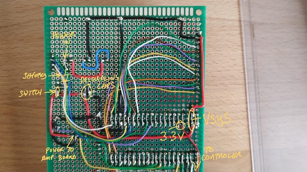 I don't imagine this will help, but can't hurt: ![]() I note now that the + line to the "amp board" is coming directly off the switch, not after the decoupling capacitors, but there is another pair of decoupling capacitors on the "amp board". Best wishes, Tom MMBasic for Linux, Game*Mite, CMM2 Welcome Tape, Creaky old text adventures |