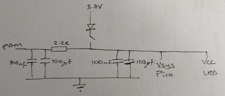 The resistor and the two capacitors will filter or decouple the supply and hopefully remove most of the noise produced by the Pico. so switching on that supply using the transistor should produce a PWM signal that has none or very little noise superimposed on it. The electrolytic will remove most of the lower frequency noise while the 0.1uF will cope with the higher frequencies. Standard electrolytics have an effective series resistance (ESR) which does limit their high frequency response (tantalims are better). Not sure if that answers what you don't get. Bill Keep safe. Live long and prosper. |