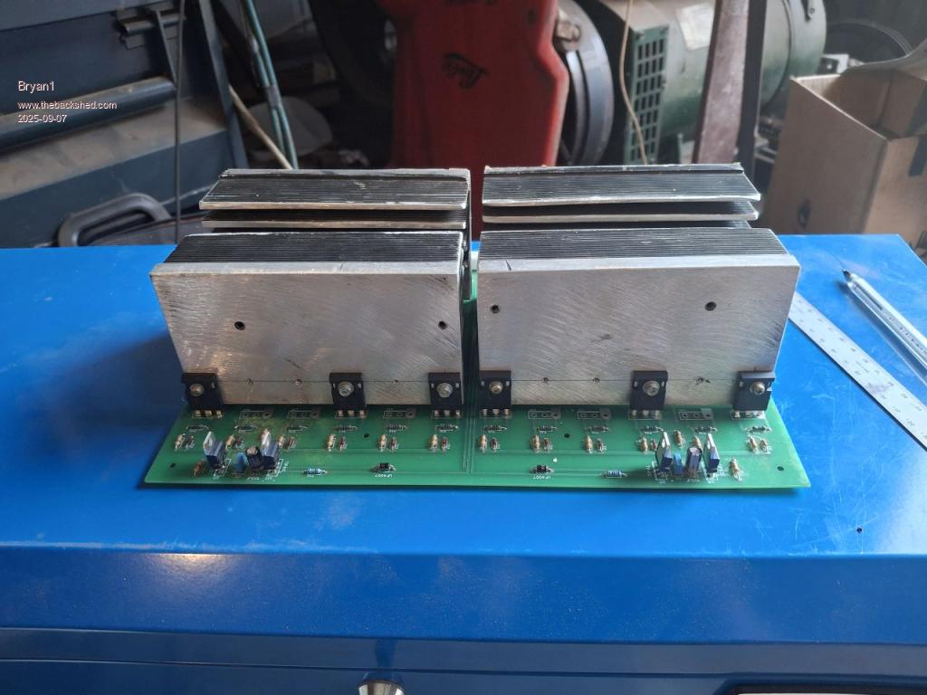 Well finally got the main board all finished now silly me after drilling didn't take the heatsink off the mill and sure enough on the 11th hole broke a tap O'well my 3mm taps have lasted well over 20 years so from then on took the heatsink off and deburred it and got the rest of the holes tapped. On one heatsink the original mounting hole on the Aerosharp got in the way but eh there is no real need to use 6 HY5608 fets each rail.![]() ![]() I still need to make some brackets to clamp the heatsinks and it does say the low side has to be isolated but this black duck doesn't know what side that is so once I do know I can join the heatsinks on the high side. Cheers Bryan |