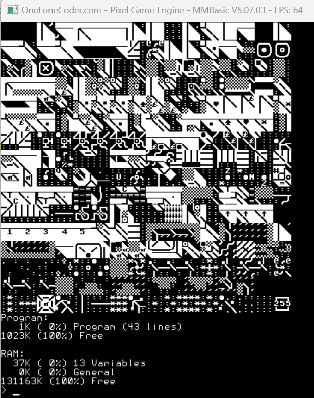 Only the heap memory is available for the program load and the usable buffer is smaller than this by 4608 + 3*HRes Heap memory is VGA 100K Pico 124k Web 80K None of this is on the agenda for change. For bigger programs - that's what the library is for. The next RC will allow loading binary data to a flash slot in a program as well as saving/loading the library from disk (command line only) NB: reading from a display is much slower than writing timer=0:blit 0,0,1,0,mm.hres-1,mm.vres:?timer 631.704 Edited 2023-09-25 20:47 by matherp |