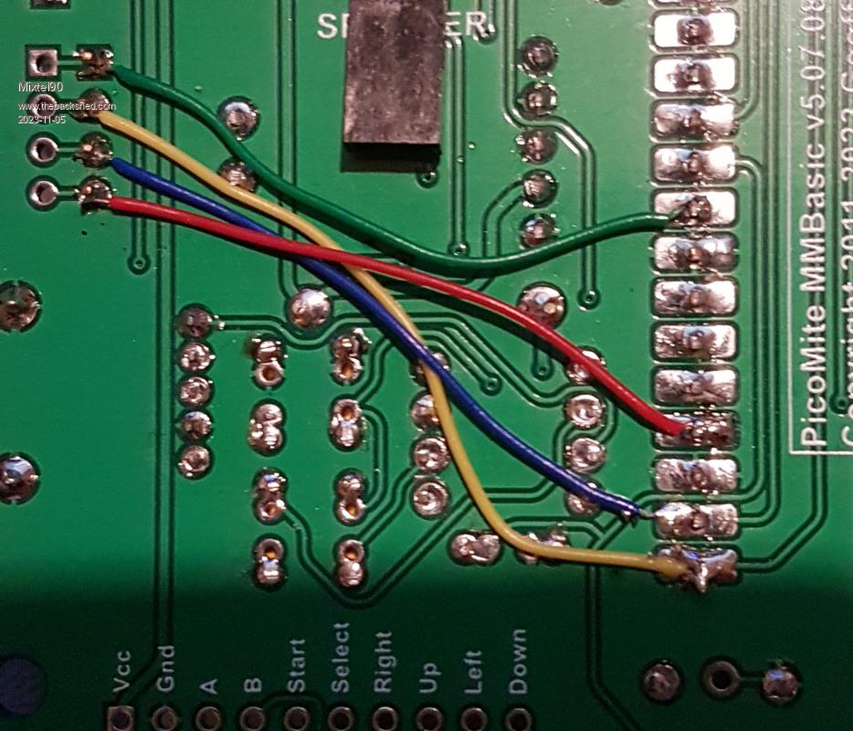 The display and touch are using SPI. On the standard construction the SD card is also connected to this. We can transfer it to different pins. We'll use GP16, GP17 and GP18 as the SD card doesn't need hardware SPI. In order to split the SD card SPI from the display and touch: Using a sharp knife or, possibly a very fine Dremel tool, you need to identify and cut the following three tracks. They are all between the PAM8302A and the connector J6 so it's a bit fiddly. The one just underneath the figure 1 The one under the figure 2 of 2.8 The bottom one Don't cut the track between the 2 and the bottom track. If you there's a work-around. :) ![]() Pins 2,3 and 4 of J6 and J7 should now be isolated from pins 5, 6 and 9 of the PicoMite. Now, on the back of the PCB, fit three wire links: J6 pin 2 - GP16 (pin 21 - yellow J6 pin 3 - GP17 (pin 22 - blue) J6 pin 4 - GP18 (pin 24 - red) If you cut the track mentioned above that's in the way (like I did) you'll need an additional link: J6 pin 1 - GP22 (pin 29 - green) ![]() Now the software has to be changed to work with the new arrangement. Change OPTION SDCARD to the following: OPTION SDCARD GP22, GP18, GP16, GP17 This keeps the original SD_CS as GP22 and moves SD_CLK to GP18, SD_MOSI to GP16 and SD_MISO to GP17. I've had this mod working today. Edited 2023-11-05 05:13 by Mixtel90 Mick Zilog Inside! nascom.info for Nascom & Gemini Preliminary MMBasic docs & my PCB designs |