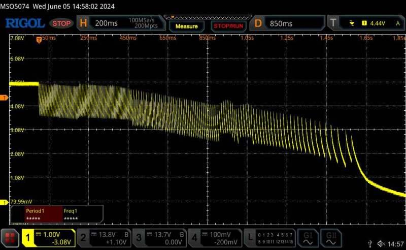 Mike your power supplies might be different to mine ??? Love your reply I am saying that trying to discharge 40,000uF with a resistor (as was suggested) is not going to work. I'm basing my comments on my Inverter and what I am seeing. I' wondering exactly what value of resistor are you planning to use to drop 48V @ 40,000uf and still pull the caps down quickly at 12v. If we stop talking about the Massive cap bank and talk about loading the 12volt 5v output rail to quickly discharge the C27 100uf, then that is a different story and will work. However - all this proves is that my original fault finding fixed the LCD problem. And this still does not "APPEAR" to be causing the Nano in the Controller any problems. My Test Setup: No Nano in the socket - No Solar. NOTE !!! Testing with ONLY a 14v supply. The results of my Controller - 14V input, some capacitance on the output of the 14v supply: The current is low and 100uf on the 5V output gives a +5V decay of over a second. It might be the 12V regulator, but it's interesting that the switching waveform only shows up right when the +5v voltage drops, could be back feeding through the 12v reg? OR feeding through the 5v regulator. Sawtooth frequency varies from 139Hz to 67Hz as it falls. EDIT The 1 second fall on the 5v output may still be influenced by the 12v regulator producing output all the way down to 2v? either way a small bit of bleed on the 5v might fix it. I'll try later this evening. 12V reg output: ![]() 5V reg output: ![]() Edited 2024-06-05 16:50 by KeepIS NANO:Inverter V 8.2ks - Linux AvrDude GUI script V4.1 |