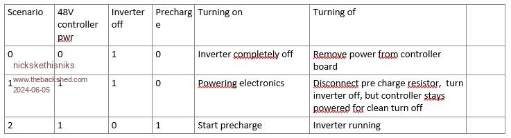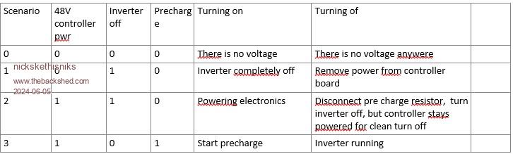 So, if I'm right the problem only occurs when bleeding of the capacitors, and is caused by the slow ramp down or up? Possible suggestion: For Auto start Instead of the Small toggle switch we could use a 3 position 3 pole Cam rotary switch. (or something simular) and also remove the diode coming from the bulk caps. This would allow to keep the controller board powered on or off without the influence of the precharge resistor or bleeding resistor. ![]() Its possible if we want to keep it cheap we need a 4 position switch. And then it would look like this: ![]() Yes, but I think my post was maybe irrelevant because of other usecase and because of wiseguy findings could also explain my problem, removing a dcdc lowered also the capacitance and in the system speeding up capacitor discharge curve. Edited 2024-06-05 18:58 by nickskethisniks Footnote added 2024-06-05 19:18 by nickskethisniks (were I thought it was a negative spike, wiseguy proved it was actually a slow ramp down/up on a certain "plateau") Switching out the switcher could or could not work, but might me worthwhile trying. |