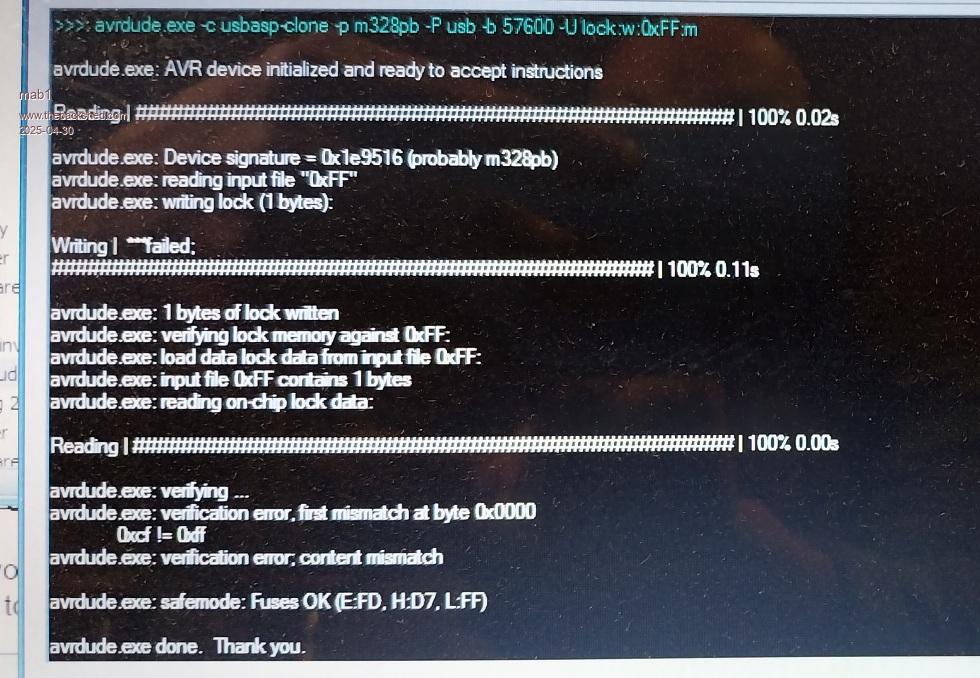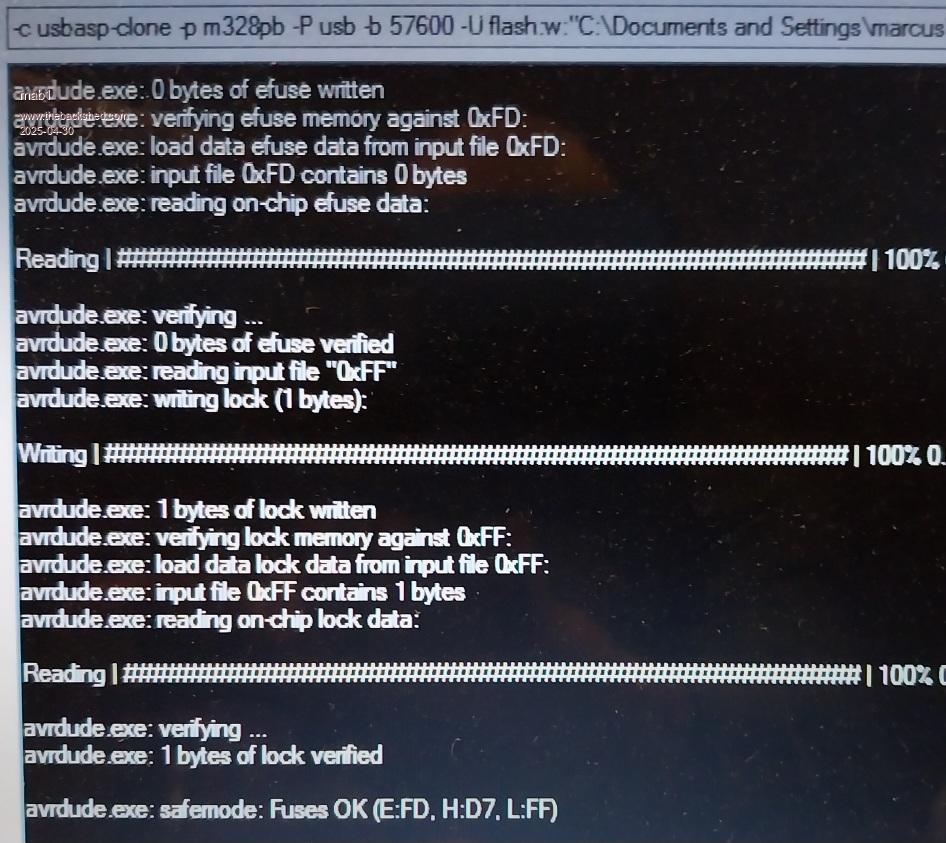 D:\A_Varoius Backup Folders\__NANO\Avrdudess Loader>avrdude -c usbasp-clone -p m328p -P usb -b 57600 -F -v -v -U lfuse:w:0xFF:m -U hfuse:w:0xD7:m -U efuse:w:0xFD:m