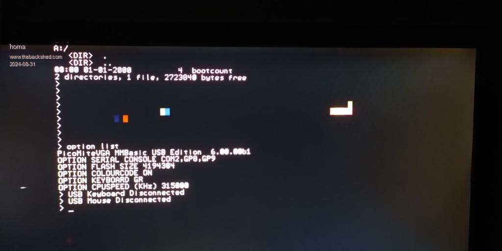 My Pico2 finally arrived :-) I have graphical artifacts with the "files" command. See picture. ![]() @Peter: Is there a way to prevent the message that a keyboard has been connected/disconnected? The reason is that I use a switcher ... PC/Pico2 By the way, the HDMI/DVI signal only works with a direct connection to the monitor. Using an HDMI matrix (Greathtek 4x2) does not work. As always, it's an exciting phase to see what's possible. Matthias |