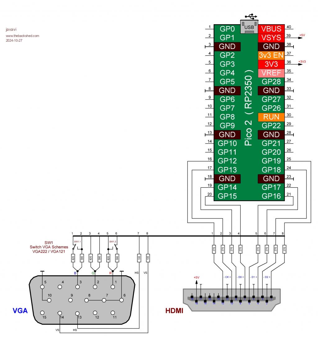 I can offer this version of the universal PicoMite board with two video outputs, HDMI and VGA. If you make both versions of video outputs on the board, you will get a universal board for both HDMI and VGA video output. Both video outputs are connected to the same Pico2 ports with their own resistors. This solution has already been tested in other projects and VGA does not interfere with the operation of HDMI (even if it is connected). Moreover, there is a method for automatically determining the type of connected monitor at startup by the state of the ports (with VGA connected, they are all in logical "0"). It is also possible to implement two VGA video output circuits, VGA222 (64 colors) and VGA121 (16 colors). Or you can come up with some kind of palette switching with the remaining two ports. |