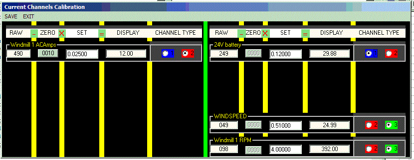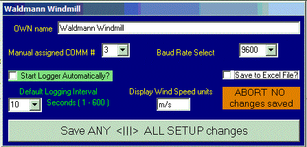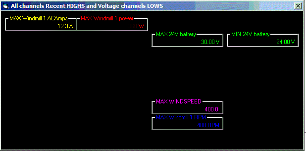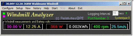 Hi Readers. I would appreciate that any readers who choose to use this program, at least present some of the data from their own windmills. At least the daily windmill power distribution and the performance graphs from windmills all over the planet would be of interest to many fellow windmill enthusiasts. There is also a file called whours.txt, that is created in the logs folder, that recordes the daily watthour at widnight during automated logging sesions. This will be useful to those readers checking long term performance of their windmills. The program recalculates the daily whours from stored data, if the program is stopped and then restarted for some reason so this recording will be reasonably accurate for recalculating whours from the data that has been recorded. It cannot make up for lost data, or if the logging was not enabled, and the program was stopped. The whour record will still update at midnght with the displayed whours, even if the data is not logged though. The bulk VB6 programming was by the royal WE, me. I have had input from Downwind,[Pete], and fillm, [Phill] with some testing and I have incorporated a mix of my own ideas and theirs, to give some more universal balance to screen layouts and content. Users should check out clicking on displayed numbers, as I have tried to incorporate maximums, and or max/minimums in the same space, that is viewed by multiple clicks, between display updates of incoming data. There is also a screen for daily maximums and battery minimum. There are some gaps in many of the windows, and this is not an error. I have removed unnecessary functions, to avoid complicating the app for most users. I would like to thank Gizmo[Glenn], for allowing the publishing and distribution of programming ideas like mine on this site. I do hope readers take the opportunity to feedback some of their own windmill data. Gordon. become more energy aware |