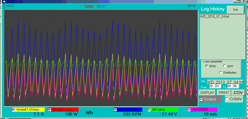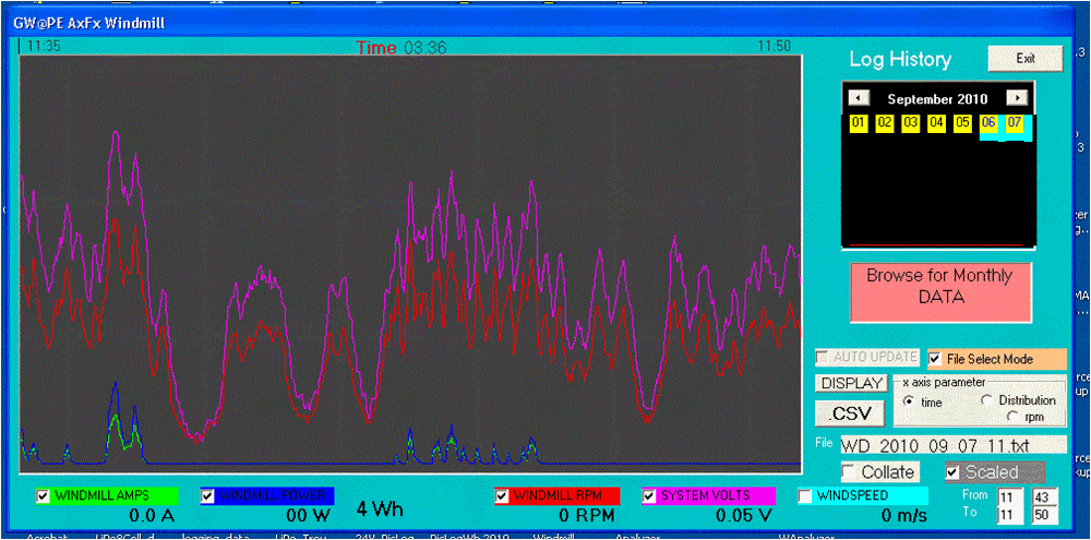 Hi Readers, I am not prepared to enter a debate on 'DATABASES' as I did not complete databases 101, but, many databases are used in commercial applications and the more complex of these require a team of database administrators, so they must be OK in certain applications. I am not convinced that a 'DATABASE' is really needed in this instance, as the windmill analyser is a relatively simple program. The program does create some folders and configuration files, but does not modify the registry and is not an installed program. The text files that hold the logged information are handled under program control. The computer file structure is used as the filing cabinet, and could be classified as essentially a multiple component database of sorts. The automatic storing of logged data directly to a database, risks contaminating a database with spurious unchecked data. A 'DATABASE' is only as good as the data in it. The windmill analyzer program does not trap all spurious data. I doubt any logging program could be trusted to automatically store completely valid data to a 'DATABASE'. I have seen the results of automatic database updating in a 'LIMS'. Unfortunately the errors were not recoverable. To perform the task of the windmill analyzer, the 'DATABASE' would need to simultanously parse the data to the storage file and be able to work on say the last 3600 to 8000 data records in real time. My objective, as I outlined above, is to have an application that does not require a keyboard or mouse to operate. I cannot see how SQL filters and a 'DATABASE' could achieve this goal. A 'DATABASE' does have searchability, and maybe the parsing of data to one could offer a historical search facility. I do not thnk it would be too hard to convert the logged data to a format suitable for a database. I do have Windows Access, so a possible future project may be on. Here is a pic of a previous 20min live update graph. I flipped to calendar view just prior to screen capture, so this could be seen as well. I normally use scaled graphs, so day to day performance is clearly shown on the graphs. If automatic scaling is used, then day to day performance graphs can look the same. Readers may question what the Voltage is doing. This is the windmill output voltage, and not just the battery voltage. This shows that windmill current is supplied below the battery voltage and indicates operation of the cap doubler.