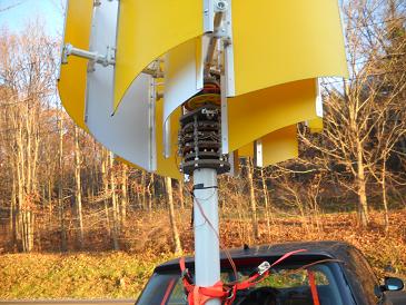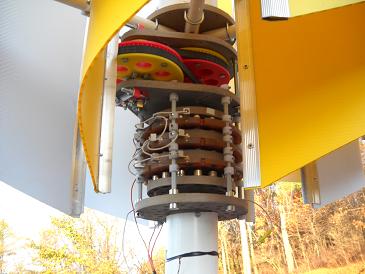 at 5 MPH it started charging @ 0.5 amps. The belt again started skipping at a 2 amp output. I tighten the belt and started over. At 4 amps output the belt started skipping again. At that point the belt was so tight that it caused a increase load on the bearings and to me it did not make any sense to continue. I was expecting to see 8 to 9 amps @ 20 MPH because of the 7:1 ratio but only had a 4 amp output and the belt was still skipping. From today’s test results I am concluding that auto timing belts at such a high geared ratio can not handle the forces being produced and the current blade configuration started to stall at a 2 amp output caused from the accumulative load of the belt drive and the PMA. The current system looks good in the picture but does not perform well. It is a learning experience and a first attempt. I am fabricating new blades and reducing the ratio of the belt drive. Comments welcome.