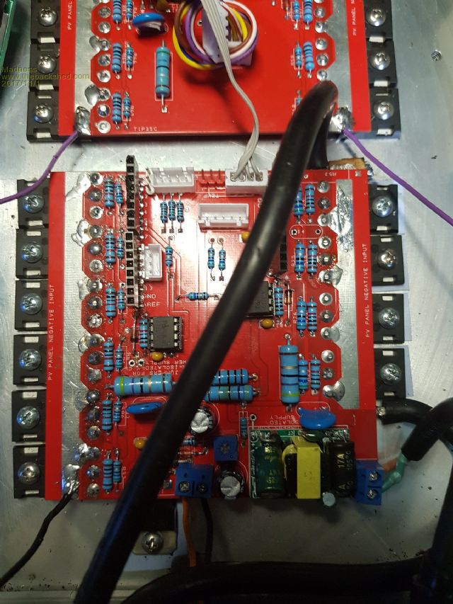 Good news, the Zeversolar GTI is back in action after having just 2 IGBT's replaced. Yesterday I discovered that there was a grounding fault on the PCB with the MOSFETs mounted on it for my charge controller. This is a part of an old inverter PCB that I cut up as a quick way to mount the MOSFETs and associated resistors.
