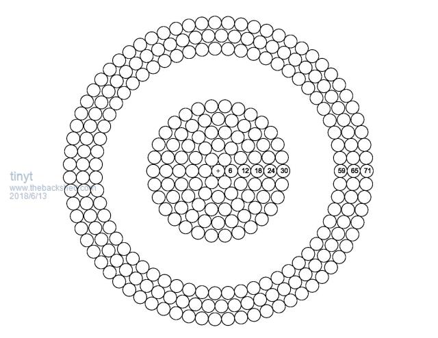 Getting back to the toroid winding thing... Circles are amazing things, and building up multi stranded cables is similar in concept to winding a toroid, but in reverse. With a multistranded cable you start out with one strand right in the middle. The first layer to go over that has six strands which fit perfectly around the middle strand (giving 6+1 = 7 wires) Now if you fit another layer around all that, twelve more strands fit perfectly around your seven existing strands (giving 1+6+12 = 19 wires) The amazing thing though, is that every new layer adds exactly six more strands than the layer immediately underneath to the total. The next layer would be 1+6+12+18 = 37 total wires) The significance of this for toroid winding, is that whatever fits on a particular layer, the next layer to go over that, is only going to theoretically have enough room for six fewer turns than the layer immediately underneath. And that six turn deficit holds for every additional new layer, as the hole area dramatically shrinks. All that assumes perfectly placed turns and no insulation between layers. In the real world it might be closer to seven, eight, or nine fewer turns per layer depending on how neatly the whole thing can be made. But its a handy trick to know when estimating what might possibly fit when a particular winding is going to take up multiple layers. Cheers, Tony. |