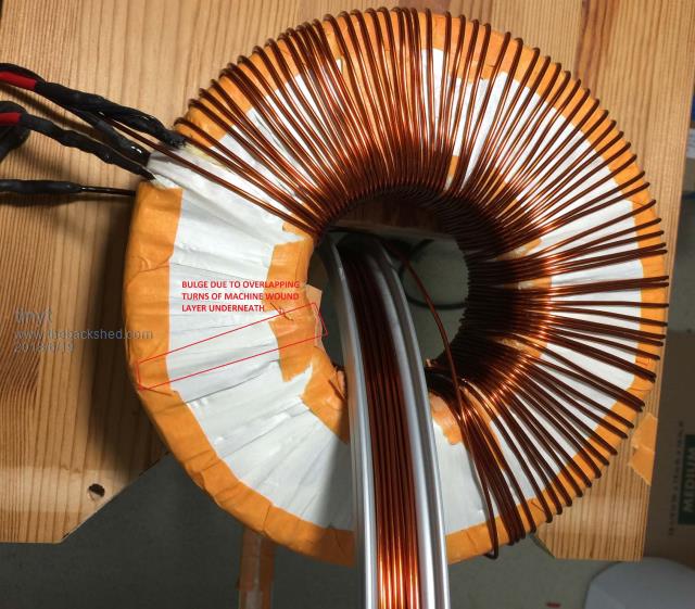 Partial winding of added 115vac section. Because the existing machine wound layer underneath has overlapping turns in several places, I was not able to place all wires inside the toroid side by side. And that is my excuse,haha. ![]() |