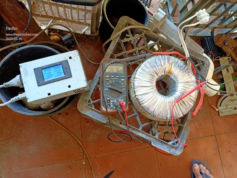 Haven't had much time to work on this, but made a start the other day unwrapping the plastic exposing the 65v primary winding, now the primary winding (RED covered wires) looked like 2 in hand and I thought, great this should take less time to to unwind.......well I was wrong, Â it was 2 layers for each winding at 90 turns each wire.![]() Just thought I would document this in case someone else tries, its good clean wire. 1 winding removed already, Once the other one comes off I will wind a few more turns onto the secondary 230v winding to lower the idle current a little more, depending on what sort of wire I find. Edited 2023-11-02 19:01 by Revlac Cheers Aaron Off The Grid |