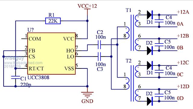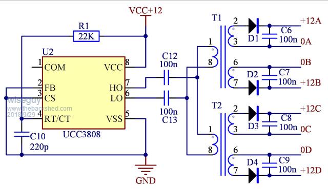I discovered two things during prototype testing of this circuit. It would not work reliably at +12v, that was too close to the +11v under voltage shut down, so had to wind up the wick to +15v at the 50Khz driver.
