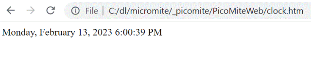Without having any real understanding of how it might work with the PicoMiteWeb, I thought/hoped that javascript might work, since as I understand it, execution is on the PC side. I have a little html file which presents Day of Week, Month, Day, Year, Time (with the time updated second by second). This works when I just put the local address of the file in a browser line: file:///C:/dl/micromite/_picomite/PicoMiteWeb/clock.htm ![]() When I try to serve it from the PicoMiteWeb, I get a syntax error: >run ntp address 162.159.200.123 got ntp response: 13/02/2023 15:26:41 String is GET / HTTP sending page [33] WEB transmit page ii%,"clock.htm" Error : Expression syntax > Here's the HTML: <html> <div id="clockbox"></div> <script type="text/javascript"> var tday=["Sunday","Monday","Tuesday","Wednesday","Thursday","Friday","Saturday"]; var tmonth=["January","February","March","April","May","June","July","August","September","October","November","December"]; function GetClock(){ var d=new Date(); var nday=d.getDay(),nmonth=d.getMonth(),ndate=d.getDate(),nyear=d.getFullYear(); var nhour=d.getHours(),nmin=d.getMinutes(),nsec=d.getSeconds(),ap; if(nhour==0){ap=" AM";nhour=12;} else if(nhour<12){ap=" AM";} else if(nhour==12){ap=" PM";} else if(nhour>12){ap=" PM";nhour-=12;} if(nmin<=9) nmin="0"+nmin; if(nsec<=9) nsec="0"+nsec; var clocktext=""+tday[nday]+", "+tmonth[nmonth]+" "+ndate+", "+nyear+" "+nhour+":"+nmin+":"+nsec+ap+""; document.getElementById('clockbox').innerHTML=clocktext; } GetClock(); setInterval(GetClock,1000); </script> <html> Am I doing something wrong, and/or is there a way to get this to work on the PicoMiteWeb (the file is named "clock.htm")? PicoMite, Armmite F4, SensorKits, MMBasic Hardware, Games, etc. on FOTS |