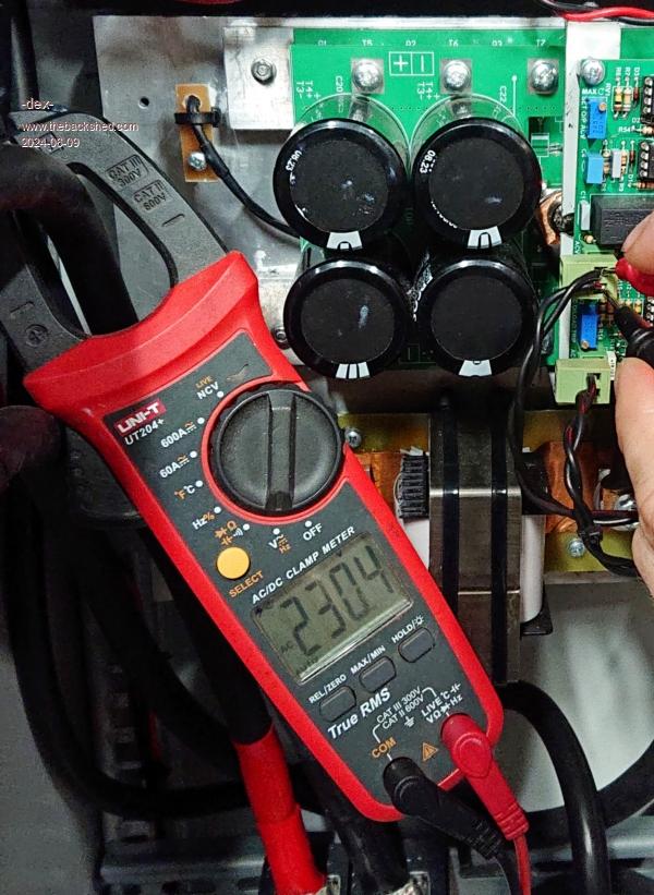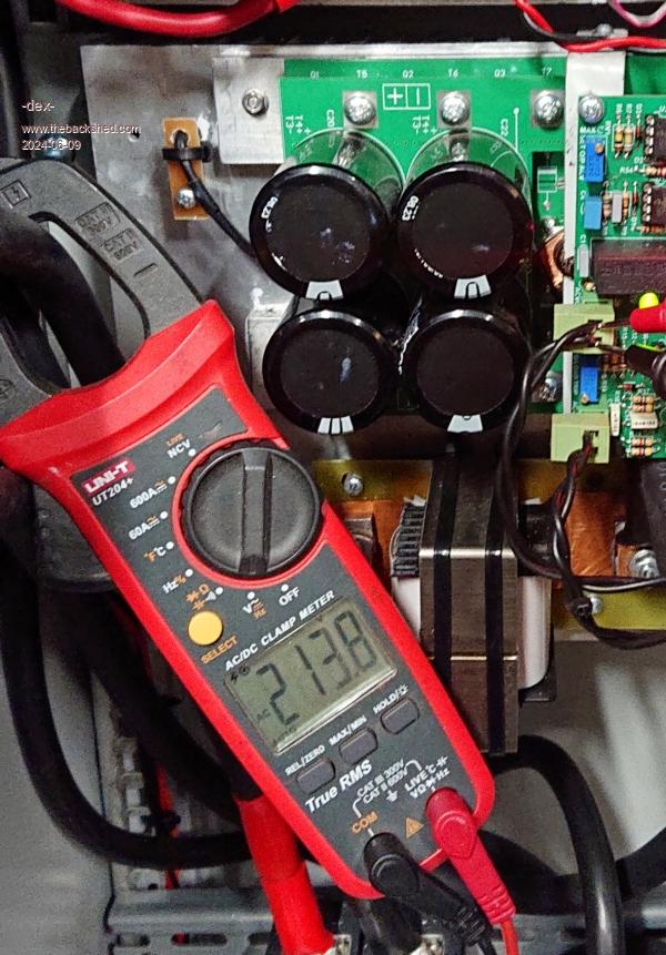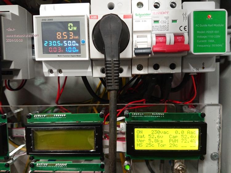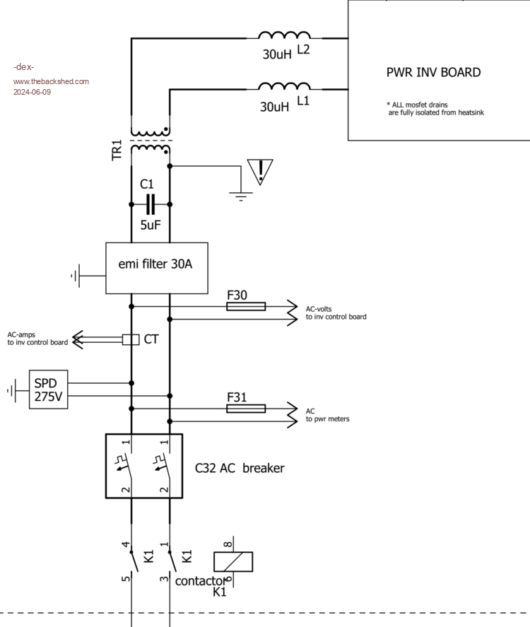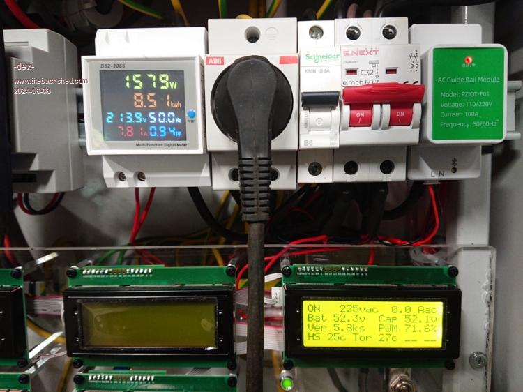 Thanks for that Dex it is very revealing. It tells me the servo loop from the DC input through inverter transformers choke etc to Ac output& fed back around the loop to the voltage feedback is happy. I deduce this because the two modulation percentages are almost the same. If there were impedance problems anywhere the % would increase to make up the shortfall. I suspect that if you measure with an AC RMS voltmeter at the two pins feeding back the AC output right at the Nano control board it will have exactly the same voltage reading of 230.5 give or take half a volt for the instance of no load and ~8A load. It appears there is impedance between the 230V transformer output and your multi function meter. It can be roughly calculated by using the difference between the loaded and unloaded AC voltage which is ~ 16V and the current difference is ~ 7.8A that tells me there is a voltage drop between the AC output winding and when it finally is measured by the meter. The resistance you are looking for is ~16/7.8 or around 2 ohms. Maybe you should grab a true RMS meter and start hunting. Hint, at 8A load, measure (ACV) between the same active wire immediately at the closest point to the toroidal with the other end of the meter to the active out of the multifunction meter, note it - then do the same at the other end of the 230V mains wiring (neutral?) from tranformer to meter neutral out. Add the two noted AC voltages together and I suspect the sum will be damn close to 16VAC. Good luck and be careful probing !! Note the AC output probably passes also through the Mains contactor/relay assuming you installed one, it obviously needs to be closed to measure the voltage drops. Welcome to ohms law. (I hope this is all correct I hate humble pie) Do you have an AC line filter in the 230VAC circuit too? Edited 2024-06-09 00:33 by wiseguy If at first you dont succeed, I suggest you avoid sky diving.... Cheers Mike |