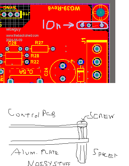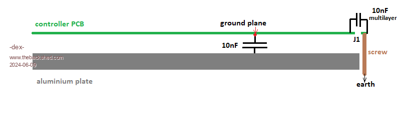 It is easier to write than draw the picture. Make a plate of aluminium same size as control PCB Screw aluminium plate where pcb is now, use spacers to screw the plate to the existing spacers (I hope you have 4 spare spacers female to male). Now solder 1 and only 10n capacitor on PCB pads just next to J1. Now screw control PCB onto the spacers sticking up from the aluminium plate. Put wires/plugs back to control card and retest. I will draw a picture but not possible for about 1 - 1.5 hour. Edited 2024-06-09 21:10 by wiseguy If at first you dont succeed, I suggest you avoid sky diving.... Cheers Mike |