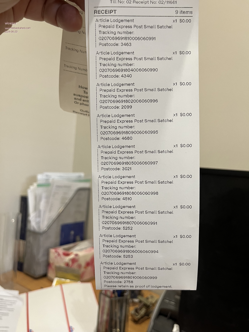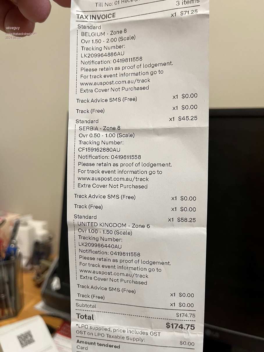 OK everything is sent/shipped. The post office did a nice printout of tracking numbers and post codes so I will just post the pictures and you can find your tracking number against your post codes.  I spent over an hour finding and going over the customs tariffs to get the chapter number etc. the lady at the post office typed in the description and then said oh what a good boy you prefilled the numbers for me hmmph. The moral of the story is you just need the description, and the software finds the category and type numbers automatically saving a lot of time and effort.