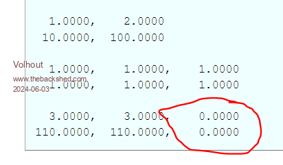 Hi Peter, Despite the fact that MMBasic implementation of the multiplication is not exactly text-book, I think I can make it work except for the c(2,xx) problem. I have no idea why these cells are left blank. ![]() Volhout edit: with larger array sizes, it seems that all cells that exceed square array are not filled. This code: Dim a(2,2)=(1,2,3,10,100,1000,32,64,128) Dim b(4,2)=(1,0.5,0,0,0, 0,0.5,1,0.5,0, 0,0,0,0.5,1) Dim c(4,2) Math m_print a():Print Math m_print b():Print Math m_print c():Print Math m_mult a(),b(),c() Math m_print a():Print Math m_print b():Print Math m_print c():Print results in 1.0000, 2.0000, 3.0000 10.0000, 100.0000, 1000.0000 32.0000, 64.0000, 128.0000 1.0000, 0.5000, 0.0000, 0.0000, 0.0000 0.0000, 0.5000, 1.0000, 0.5000, 0.0000 0.0000, 0.0000, 0.0000, 0.5000, 1.0000 0.0000, 0.0000, 0.0000, 0.0000, 0.0000 0.0000, 0.0000, 0.0000, 0.0000, 0.0000 0.0000, 0.0000, 0.0000, 0.0000, 0.0000 1.0000, 2.0000, 3.0000 10.0000, 100.0000, 1000.0000 32.0000, 64.0000, 128.0000 1.0000, 0.5000, 0.0000, 0.0000, 0.0000 0.0000, 0.5000, 1.0000, 0.5000, 0.0000 0.0000, 0.0000, 0.0000, 0.5000, 1.0000 1.0000, 1.5000, 2.0000, 0.0000, 0.0000 10.0000, 55.0000, 100.0000, 0.0000, 0.0000 32.0000, 48.0000, 64.0000, 0.0000, 0.0000 But the C() matrix should be filled with: 1.0000, 1.5000, 2.0000, 2.5000, 3.0000 10.0000, 55.0000, 100.0000, 550.0000, 1000.0000 32.0000, 48.0000, 64.0000, 96.0000, 128.0000 Edited 2024-06-03 18:32 by Volhout PicomiteVGA PETSCII ROBOTS |