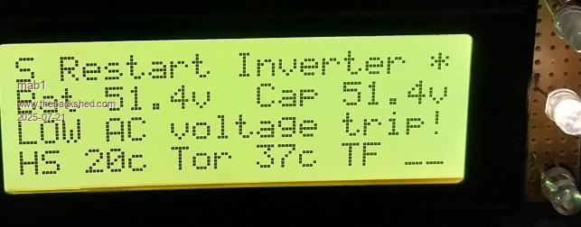 Probably not your stuff up but mine Wiseguy I downloaded copies of the schematics early on so I wouldn't have to go looking for them when I needed them. But I didn't check to see if it was the latest version when I came to use it Finally got it connected to the battery today: ![]() Not yet tidied up on the ac side but ok to start testing. Tried a couple of small loads then connected the mahoosive chest freezer as a longer term test, and to see how it was with a big start surge - fine, although it did manage to trip once in about 5hrs on overcurrent. I don't have any solar connected to the 48v battery yet, so once i was sure it was happy with the freezer I switched a couple of gti solar arrays onto it as they're on plugs and easy to transfer over. I can't recall if anyone else was planning to backfeed with gtis, and it wasn't very sunny so it was only 500w, but the inverter didn't bat an eye when backfeeding Gradually left it for longer periods but kept popping back to check as I don't want the freezer to defrost, but then after about 5hrs from Startup, I came back to this: ![]() Note the torroid temp was high. I couldn't really figure out what had happened so I reset the inverter- it started fine and started the freezer fine, but the transformer seemed a bit noisy, and after a couple of minutes it was getting louder and rougher sounding, and seemed to be pulling a couple more d.c. amps than it ought, so I unplugged the freezer. The transformer got quieter, but was still loud, and was getting louder even with no load, and putting my hand on it, the primary was getting hot so I turned the inverter off.Thinking about it, I'm guessing I'm losing drive to one corner of the h-bridge (again - i had that on the test bench, but i fixed that solder joint for sure)? But I'm not sure yet and need to do some testing . I'm guessing I must have a dodgy solder joint somewhere.Edited 2025-07-21 10:32 by mab1 |