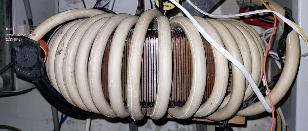 The temporary transformer is the aerosharp with all it's existing windings, primary and secondary intact, so 16mm is the biggest I can fit. I was thinking 16mm would suffice for 3kva, but since your comments I've noticed the primary getting warmer than i was expecting - and realised there was a flaw in my thinking: I was thinking 3kva @battery voltage (50 - 60v) would equate to about 60A, which 16mm should handle; but of course it's not battery voltage, it's the 26 or 27v for 230v out that the primary it wound for, and 3kva @27 volts is a lot more amps. So for testing to higher loads I've cobbled up another temporary transformer: ![]() This is the variac core with 37 turns of 50mm2 . Using the 230v winding as it is so runs about 16W at 230v Due to the smaller core cross section it needs more turns/volt, but there's room for 70mm2 in that huge centre hole (50 is what I've got). Although my inductors are still wound with 16mm2 for now I ought to get on with winding the double stack really, but I feel it may be worth playing a bit with transformers first. |