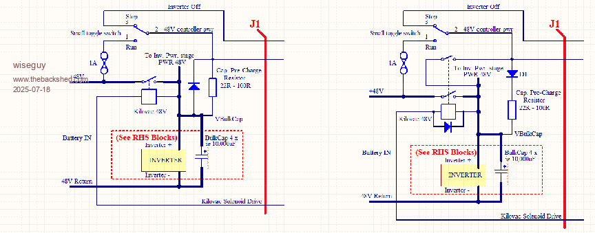 If everything else is wired correctly then changing the 5V reg to wiseguys modified 5V circuit as you have done should stop that flashing ![]() The only effect of a higher value Precharge resistor is a slower startup time before the capacitor banks are charged equal to the Battery voltage, then the Nano enables the Solenoid and SPWM. _ Edited 2025-07-15 14:01 by KeepIS NANO:Inverter V 8.2ks - Linux AvrDude GUI script V4.1 |