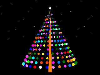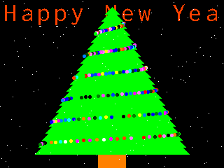 Merry Christmas & Happy New Year! ![]() MODE 2 FRAMEBUFFER create FRAMEBUFFER write f T$="Merry Christmas & Happy New Year!" x=700:h=160 Do CLS If x<-350 Then x=700 Text x,5*Sin(x)+10,T$,C,5 C=Rnd*&HFFFFFF:x=x-1 Text x,5*Sin(x)+10,T$,C,5,,C C=RGB(BROWN) Box 140,220,40,20,1,C,C C=RGB(GREEN) For i=10 To 110 Step 5 Triangle h,i,h-i,i+i,h+i,i+i,C,C Next i For i=4 To 43 Step .1 p=i+Timer\100 If Cos(p)<0 Then C=Rnd*&HFFFFFF Circle h+2.5*i*Sin(p),i*5,2,,,C,C EndIf Next i For i=0 To h Pixel i+i,Rnd*240 Next i FRAMEBUFFER copy F,N,B Loop |