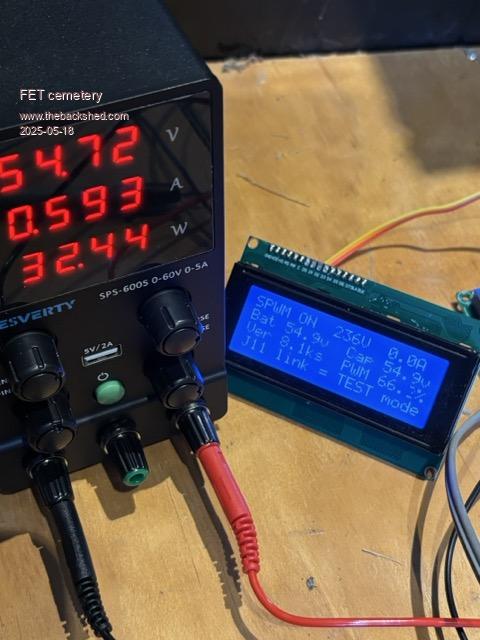 With the variable voltage¤t supply connected to the power board B+ (T1) and B- (T2) there is no physical connection between the 12V for the controller and the variable V&I supply. So the Mosfets can power up a choke and toroid with SPWM with whatever voltage you set the variable supply to. The PWM will be at 99% but it wont distort and you can increase the voltage/current as required until the mains output is at say 250VAC, then plugging in the mains feedback to the controller J2, it should regulate to the output setting from RV1 on the controller board.