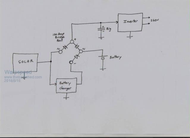 I still have memories of helping to launch an aluminium power boat in Port Philip Bay. Up to my knees in salt water gripping the hull with one wet had and touching a +12v dc battery terminal with another wet hand. It was a pretty nasty bite !! So I do have a LOT of respect for dc voltages, but extreme care, awareness, old age, and faith in God, have so far saved me from being fried. My system operates in a fairly unique mode, and as you say it favors a big solar small battery installation. As soon as the sun begins to have sufficient strength at dawn, battery discharge falls to zero and it begins to charge the battery, but at a low set limited current. Its set so low, that grey dismal awful days make very little difference. During the day, the inverter runs straight off the solar panels at voltages up to around 140v. Nothing at all is drawn from the battery during the day. When any one individual cell of my battery reaches 3.45v the charger shuts off, and stays shut off. My battery sees only a long slow continuous charge during the day, and one long slow continuous discharge at night. Software detects the 0v from solar at night and resets the charger for another go at dawn. Minimal battery charging current, and one continuous charge/discharge cycle every 24 hours. From what I have read, this is the very best way to get maximum battery life from Lithiums by reducing the number of charge/discharge cycles. Having the more usual tightly coupled solar controller/battery/inverter combination means that some very high currents can be shuffling in and out of the battery during the day. Charging at 80 amps one moment, and discharging at 80 amps a few minutes later cannot be good for the battery. I hope this very gentle treatment of the battery will result in extended battery life. Its going to take quite a few years to test this theory. Cheers, Tony. |