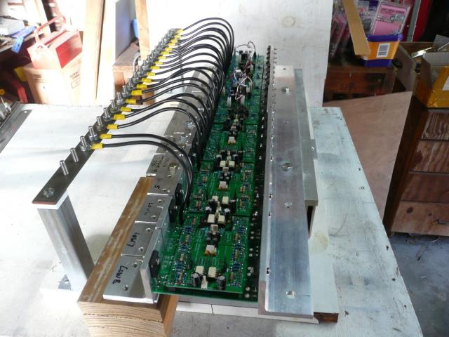 Hi Tony This will be going into an existing 24v system. This is my FET_Bridge board setup on it's heat sink. The first transformer is driven by the first 3 boards, which are half bridge + full bridge + half bridge. The rest of the transformers are driven by one full bridge board each. 10,000uF caps (x4, one each on the first 4 boards) are mounted underneath the boards. The FET boards with their driver boards plugged in. The Fets driving the 2 smaller transformers shouldn't need big heatsinks so I'm just using the heavy AL angle. Next will be the Bench Test .... Cheers Andrew |