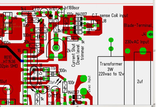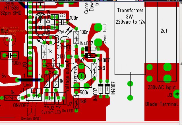 Clockman one suggestion if I may? Draw 230v part of copper more sideways from carrier holes - safer distance... I would minimize these routes, there is no need to be there to the end of PCB and all around. Same for plus pole, supply line from 120E resistor shall be wide enough, but not spilled all around if you don't want to spread unwanted noises from power board.