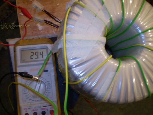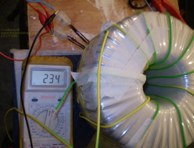 Pics/photos …… shows the toroid test, just using a 2.5mm2 test primary wire. ………… 234vac going in the secondary’s after the step up light bulb process, ……… and 29.4vac reading on the Primary. So we are in the right ballpark.