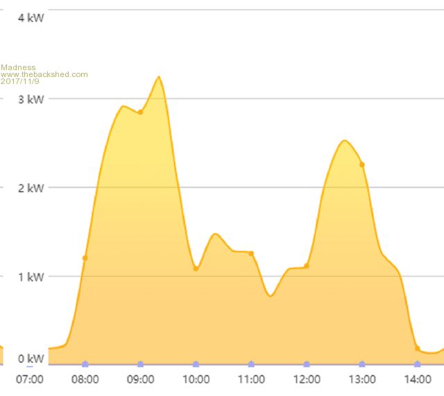 Even though it has been a showery day we had a couple hours of sun this morning and the batteries where back up to 100% charge by 10:30 so the regulator cut back the GTI's output till later in the day when my wife did some baking.