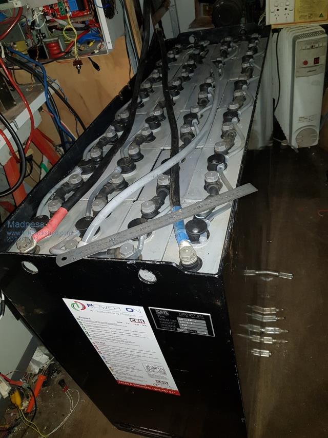The new battery is going really well after an initial problem with power dropouts. Turned out someone (not me) had not tightened one of the interconnectors properly, it was about 3/4 of a turn short of being tight. Only showed up when drawing over 100A, since tightening it the battery has been running perfectly. The new battery can complete the absorb cycle @ 59.2 volts and holding that voltage with just 15 amps.