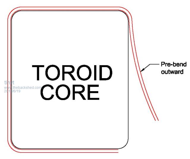 I "discovered" that if you pre-bend the wire outward prior to laying on the flat surface of the toroid, it will no bulge outwards.