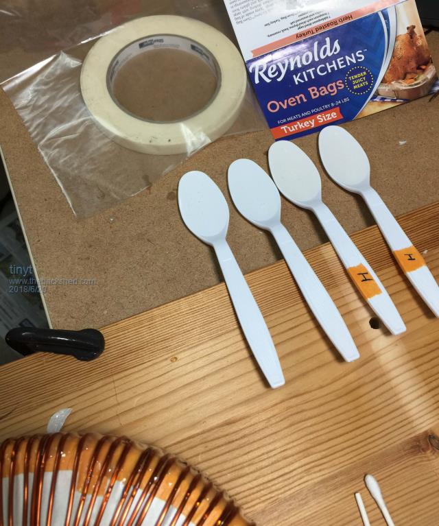 Started epoxy. I used disposable spoons for measuring. Did not have paper cups, so I used whatever is available for mixing (poly bag sheets and Q-tips).