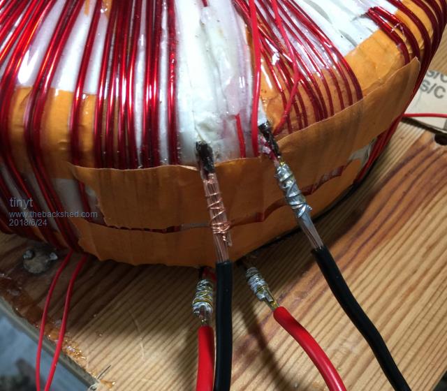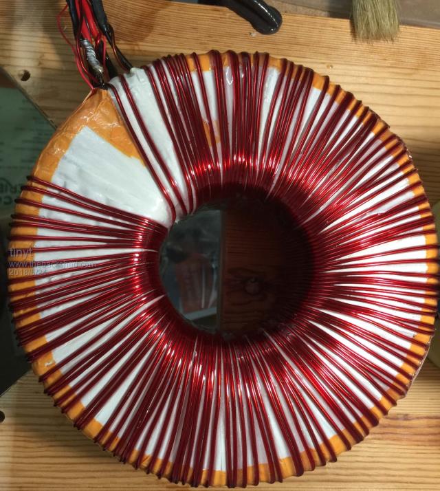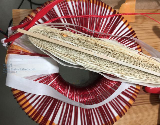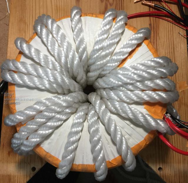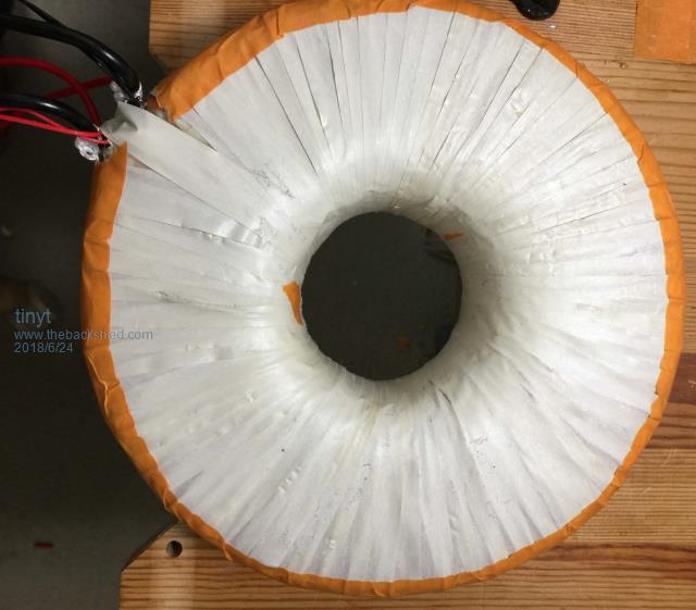 Here is the second added 115vac winding. Same awg as the first, but the 118 turns still fit in the toroid ID with room to spare. The wire is softer than the earlier one I used, so I was able to pull tighter together.