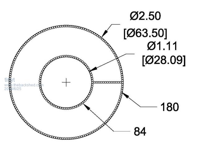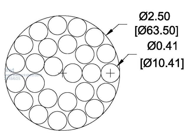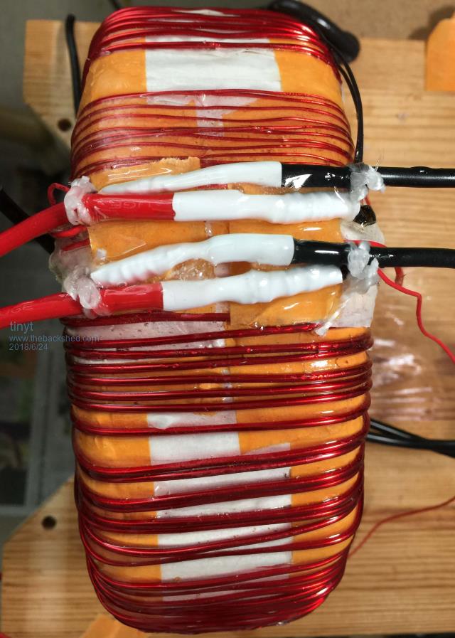 Doing some calculations: The secondary is composed of 4.17 mm sq. and 2.08 mm sq. wires giving a total of 6.25 mm sq. Using the 9:1 ratio, the primary should have 6.25 x 9 = 56.25 mm sq. I am waiting for my purchased 0.91 mm wire (0.653 mm sq.) to be used for the stranded primary. This requires 56.25 / 0.653 = 86 strands. For 26 turns there will be a total of 86 x 26 = 2236 strands inside the toroid. If the 86 strands were arranged in a perfect circle that is completely filled, the nearest number of strands is 91 with a circle diameter of 10.41 mm, this is rounding up the 0.91 to 0.94 mm strand dia. Drawing a polar array of these 10.41 mm strand groups inside the 63.5 mm inside diameter of the toroid shows that the needed 26 turns will barely fit under ideal conditions.