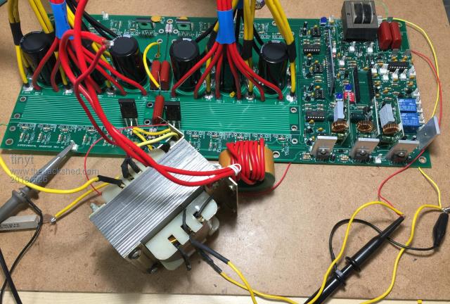 I have a small EI transformer that has 110vac primary and several secondaries. I was able to configure it for 26vac input and 115vac output. I used it for the first mosfet testing: Four mosfets, 10 ohm series resistor, bulk capacitors bypassed. 1.5 ampere power supply set to 54vdc. ICs on board are two IR2010s and one modified EGS002. The transformer has no load. See picture below.